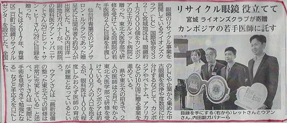 この取り組みは宮城ライオンズクラブが2017年、宮城県青葉区にメガネリサイクルセンターを設立し、中古メガネを洗浄・仕分けしてカンボジアやベトナムなど10カ国に贈る事業に提供されます。